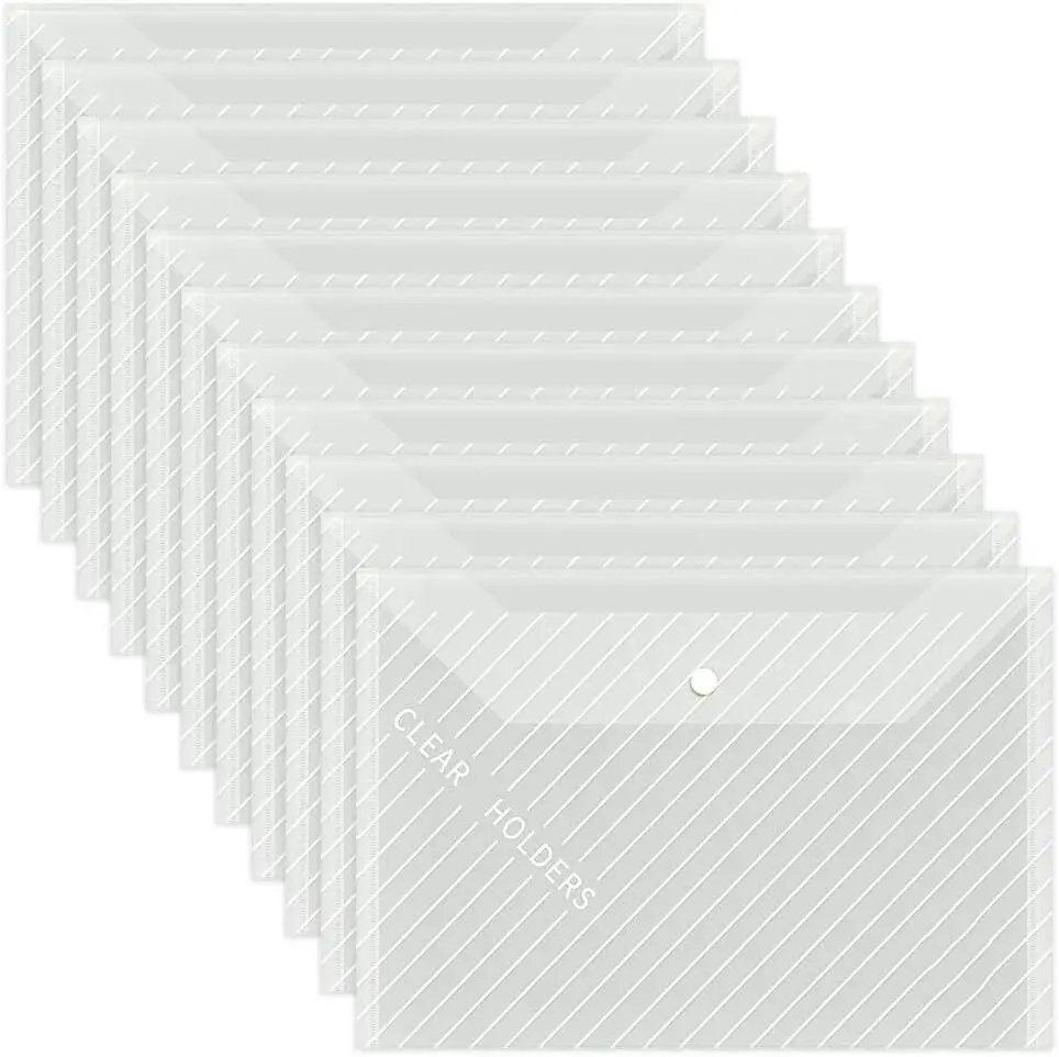 These A4 snap file folders offer a simple and reliable way to store important documents. The clear plastic design makes it easy to see contents without opening the folder. Each envelope features a secure snap closure to keep papers in place. Ideal for school assignments, office paperwork, and home organization. The lightweight yet durable material protects documents from dust and moisture. A4 size compatibility fits standard papers, forms, and worksheets. Easy to carry in backpacks, briefcases, or folders. The smooth surface allows quick cleaning and long-term use. Perfect for organizing reports, receipts, and notes. This 10-piece set provides a practical storage solution for everyday document management.
