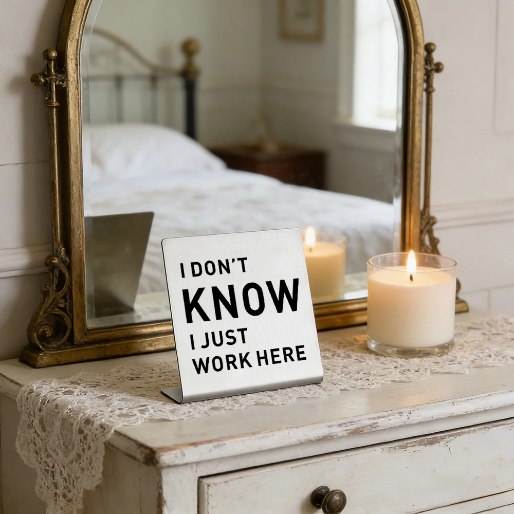 This “I Don’t Know, I Just Work Here” desk sign is for the people doing their best while answering questions that are absolutely above their pay grade. With its clean stainless steel look and perfectly deadpan message, it adds instant personality to your desk, cubicle, or home office without trying too hard. It is the kind of office decor that says exactly enough and somehow still stays professional-ish. Perfect for coworkers, managers, reception desks, and anyone whose daily workflow includes being asked things they did not sign up to know. The sleek metal finish gives it a polished feel, while the sarcasm keeps it firmly in Margins & Meetings territory. Great as a funny gift, stress-relief desk piece, or little reminder that not every problem belongs to you. It is practical, witty, and just self-aware enough to earn a laugh from the right people.