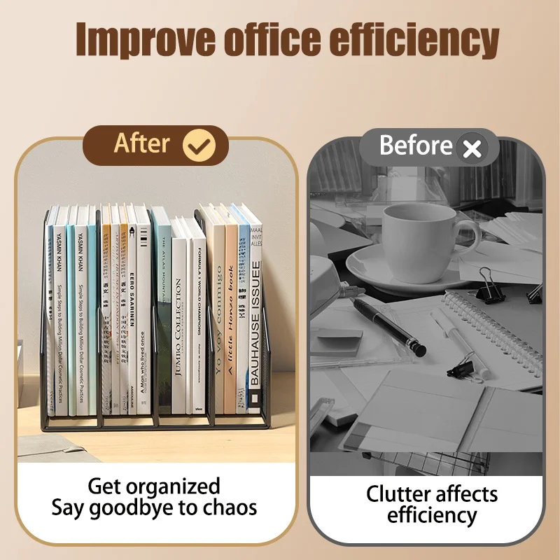 This vertical mesh file organizer is made for the folders, papers, mail, and “deal with this later” stacks trying to take over your desk. With a tall, space-saving design and multiple angled slots, it keeps documents upright, visible, and way easier to grab when you need them. The open mesh style gives it a clean, modern look while helping your workspace feel more organized without looking heavy or bulky. It is perfect for file folders, notebooks, incoming mail, paperwork, and all the desk clutter that multiplies when no one is paying attention. Great for home offices, study spaces, reception counters, and work setups that need more structure and less pile chaos. The vertical layout makes the most of your desk space while still keeping everyday essentials close at hand. Durable, practical, and easy to style into almost any setup, it is one of those pieces that quietly makes the whole desk function better.